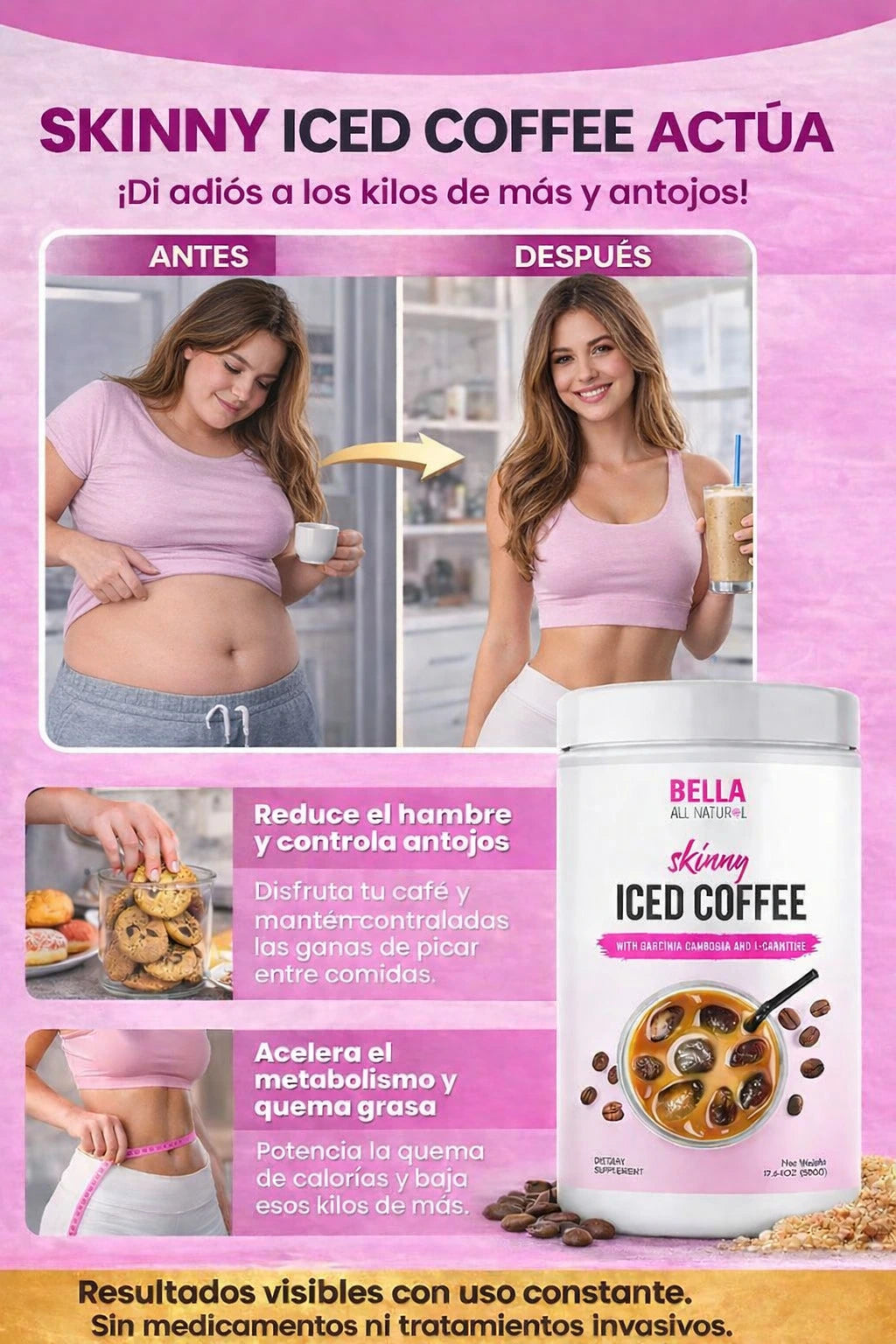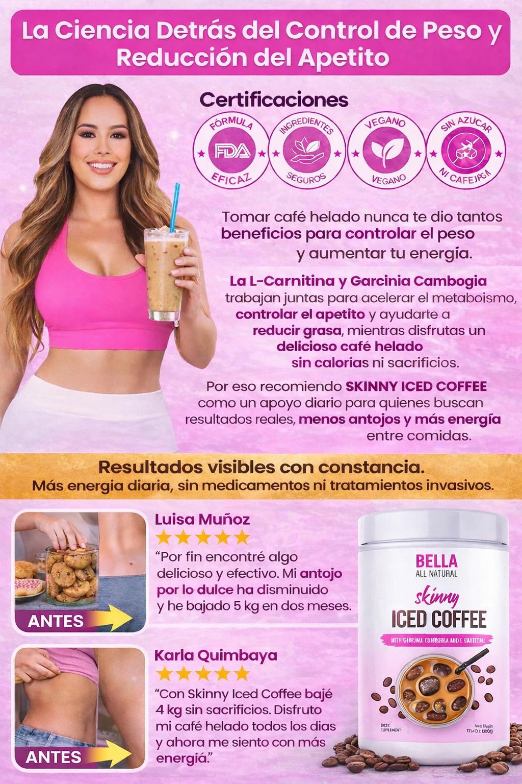 Skinny Iced Coffee es un café helado funcional hecho con café arábica de alta calidad y superalimentos como Garcinia Cambogia y L-Carnitina, diseñado como reemplazo de un café regular con beneficios adicionales para apoyar el control de peso y energía durante el día.